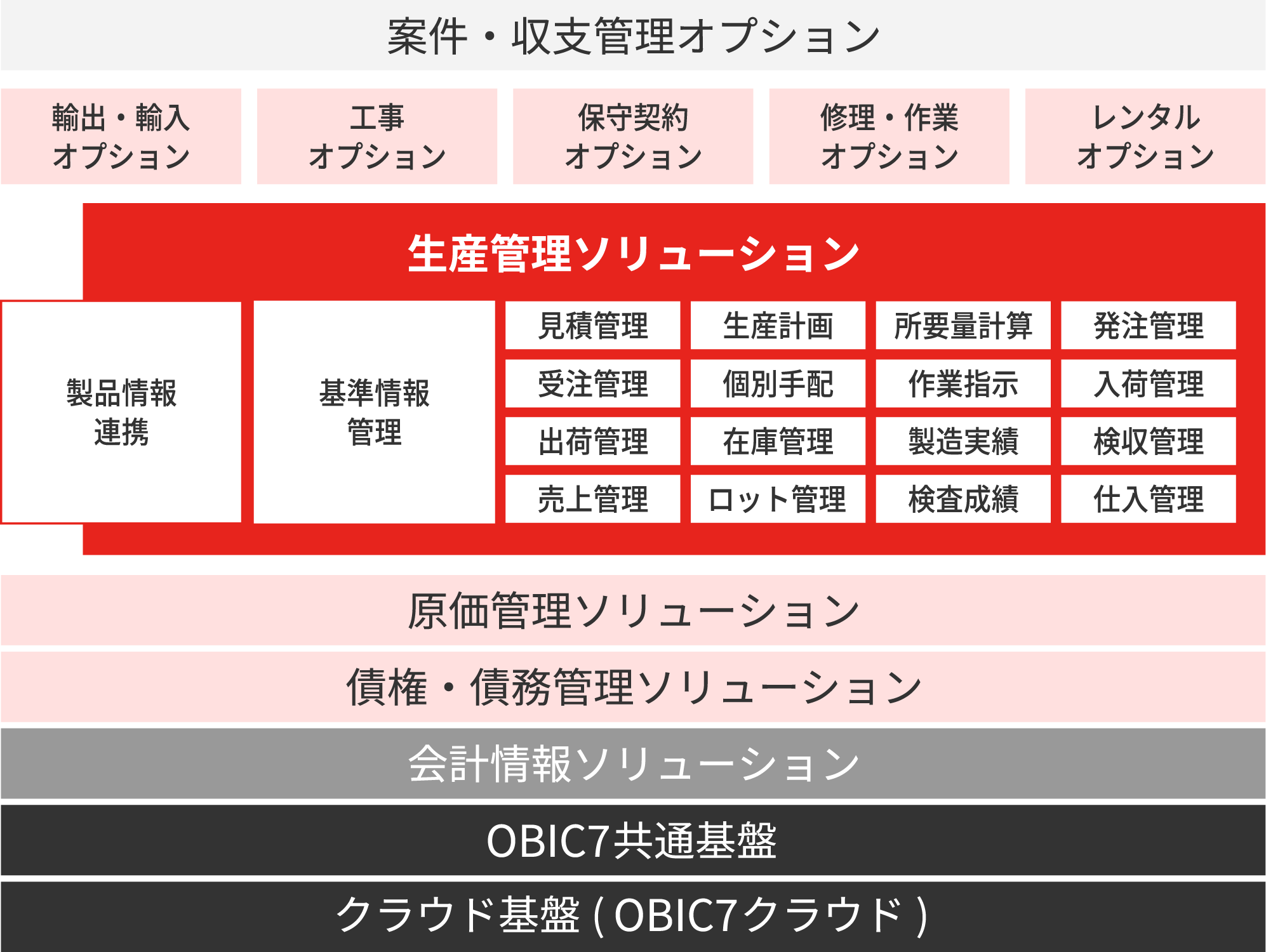 製造・販売に加え、輸出入、工事、保守、修理、レンタルなどの関連業務も必要な機能を自由に選択・組み合わせて一つのシステムで統合管理できます。原価や債権・債務と会計情報を統合し、経営の適切な意思決定を支援。戦略的な事業展開をトータルにサポートします。さらに、これらすべてをクラウドで実現可能です。
