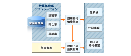 従業員情報の取込から、退職一時金・企業年金制度・厚生年金基金などさまざまな退職給付制度への対応、基礎率計算シミュレーション、退職給付債務の自動積算、そして退職給付仕訳の自動作成、会計基準に準拠した注記情報の表示まで、企業の退職給付会計をフルサポートする、高機能・高品質システムです。